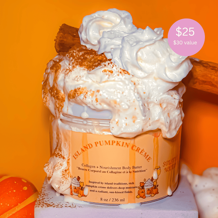 Indulge your skin in a warm, creamy ritual inspired by Caribbean comfort and fall sweetness. Our Island Pumpkin Crème Body Butter is a rich, whipped blend of nourishing butters, silky plant oils, and natural skin-loving ingredients that melt into your skin like velvet. Infused with our signature Pumpkin Crème Accord—a blend of vanilla, pumpkin spice, and island warmth—this decadent butter delivers deep hydration, long-lasting softness, and a healthy Caribbean glow.